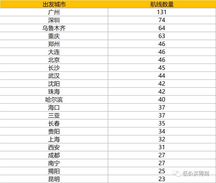 KK汇总了南航部分城市的航线数量。