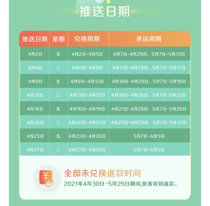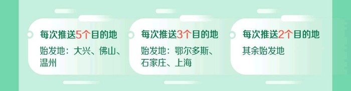 每周二,五推送可选目的地,具体推送日期、兑换日期、出行日期如下: