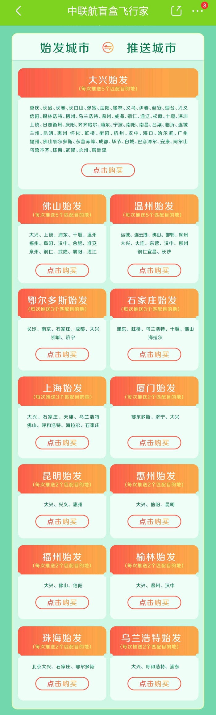 航线多的城市,比如北京,随机推送目的地时,选择很多。运气好的话,也可能分配到北京往返三亚!