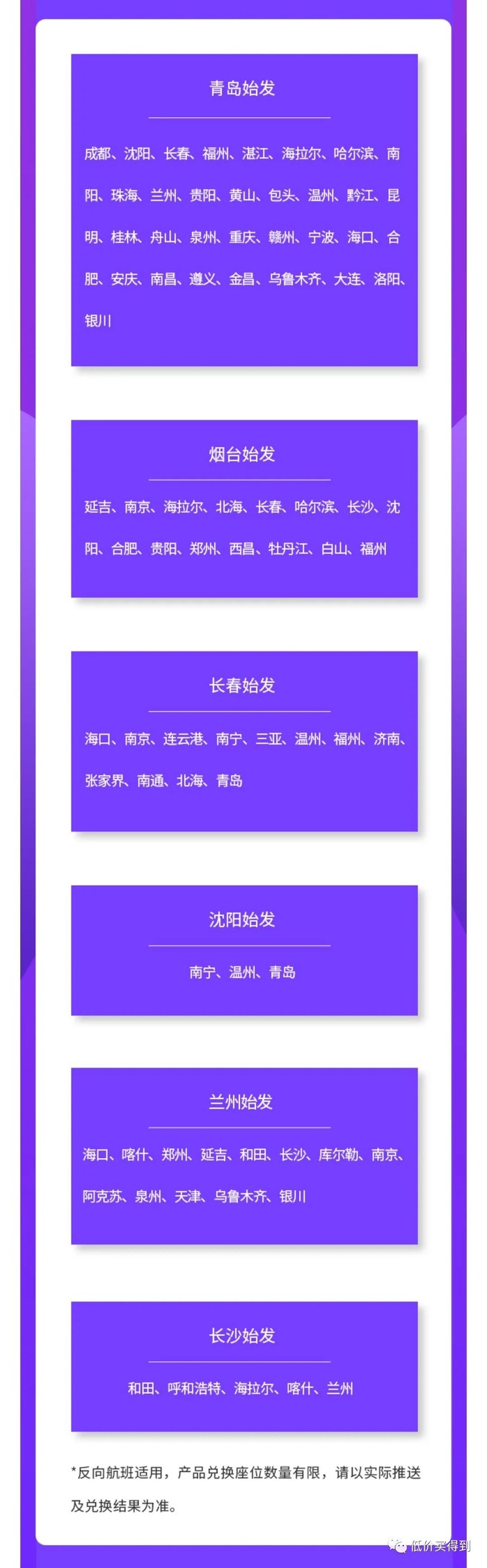 可选出发地:青岛、烟台、长春、沈阳、兰州、长沙,有可能推送的目的地如下。(可滑动查看)