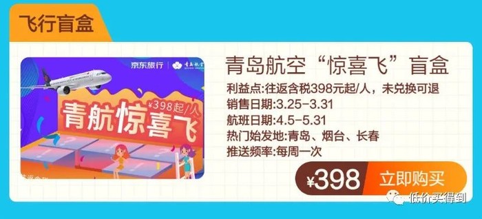 含税398元起往返,青岛航空盲盒,五一可用