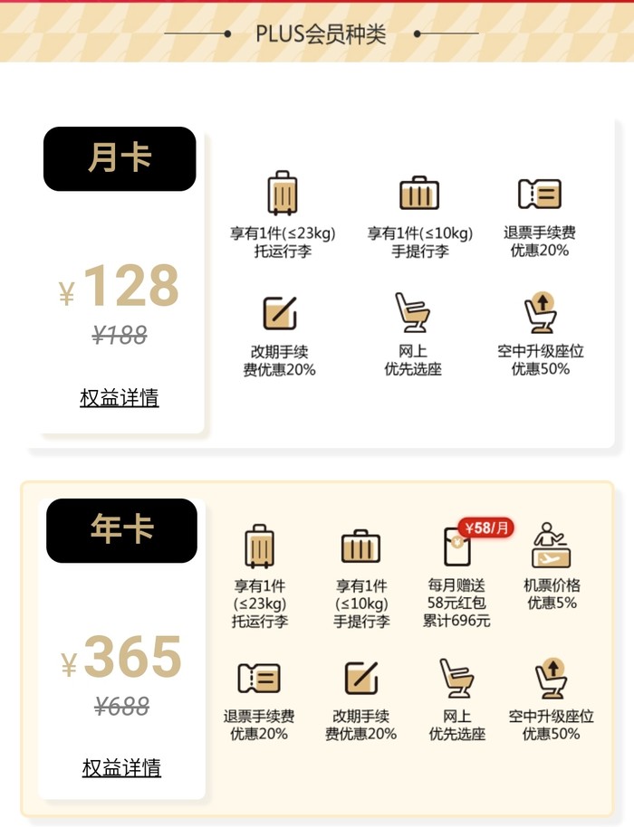 购买中联航plus会员,月卡优惠价128元,年卡优惠价365元,有效期内,每次飞行都有23Kg行李托运额!购买平台:中联航APP