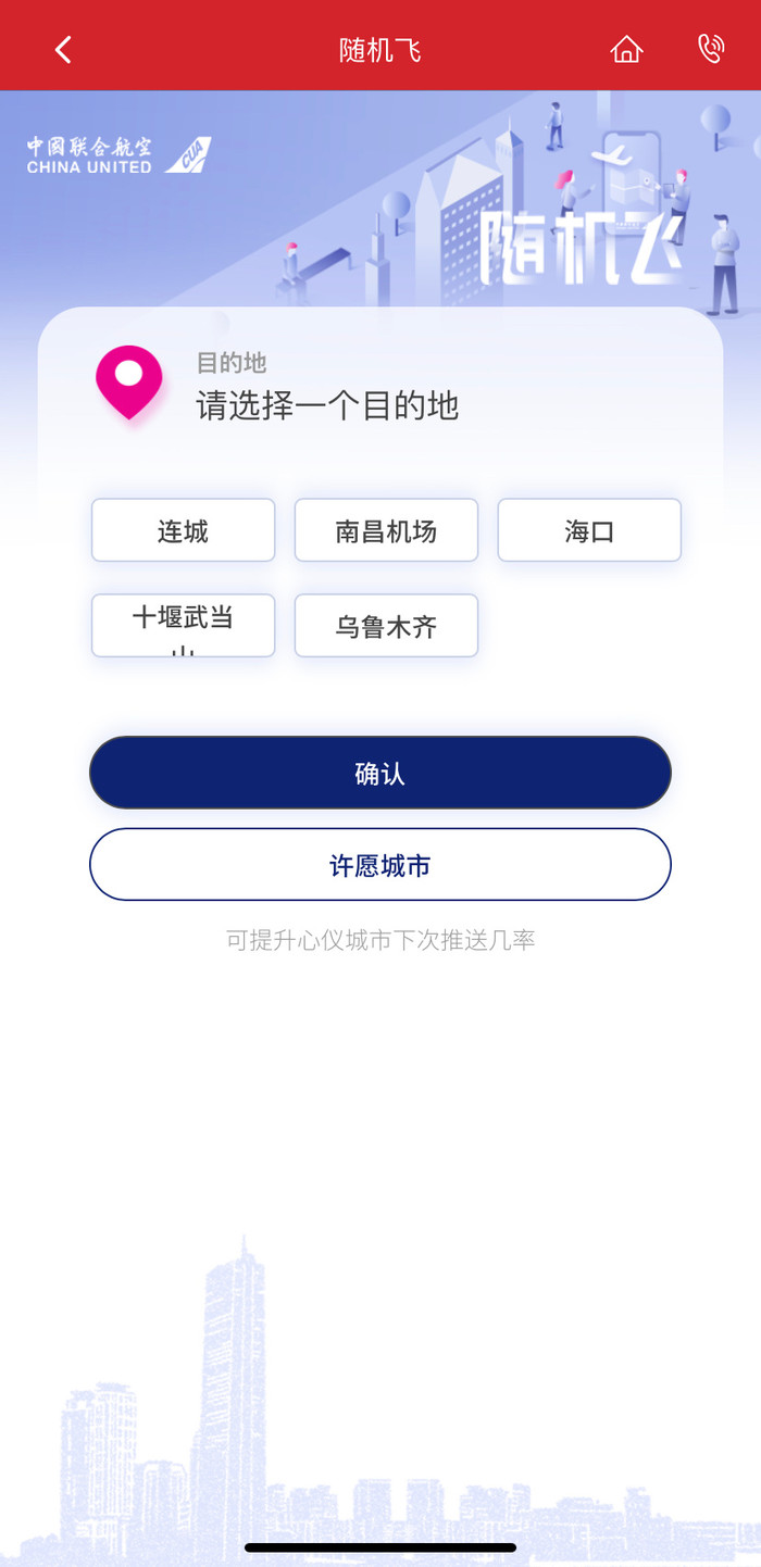 每日10:00-24:00可通过中国联合航空APP或M网“随机飞”入口查询当日目的地。