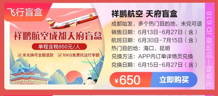 祥鹏航空成都天府机场盲盒,含税650元/套,兑换单程机票1张,含10kg行李托运。