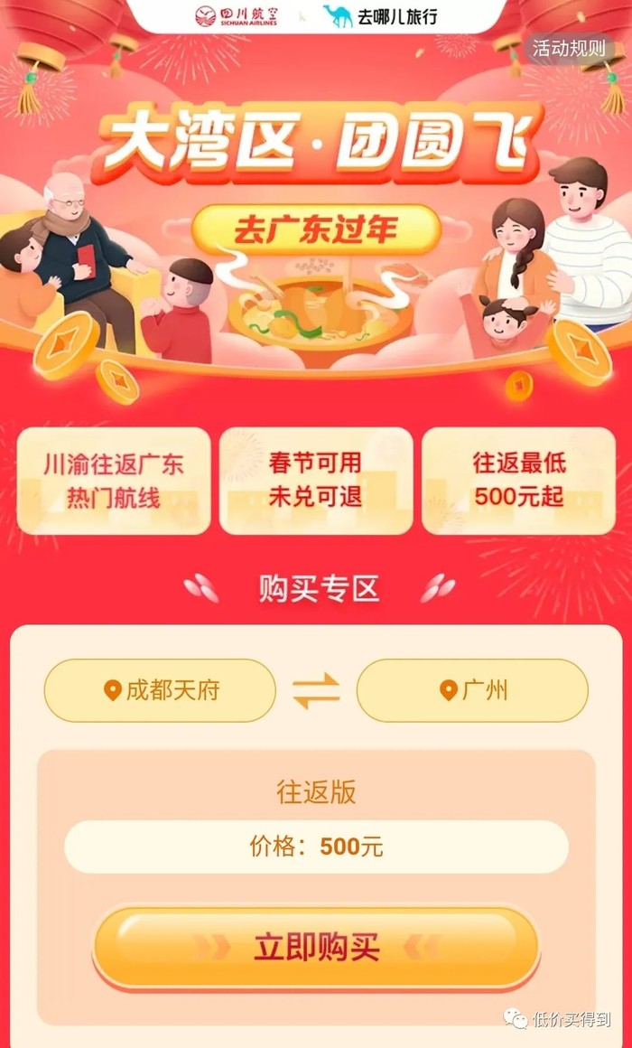 购买平台:去哪儿匹配-机票-川航大湾区团圆飞活动图,直达链接:网页链接