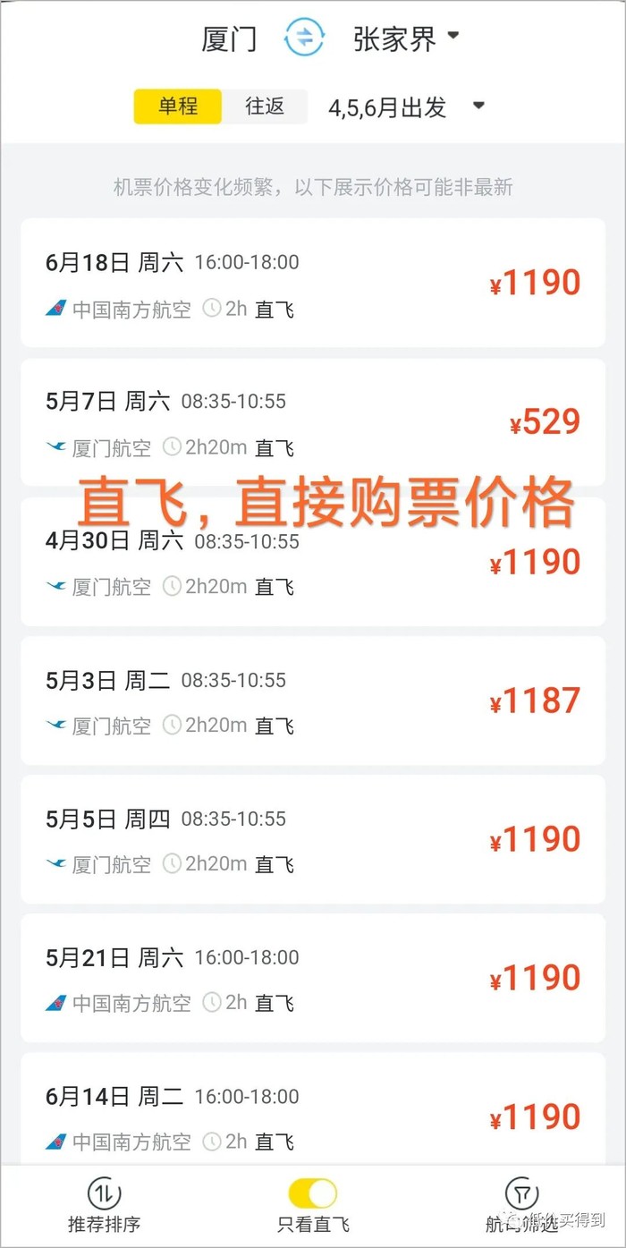 厦门飞张家界,直接购票,单程直飞票价530元起,厦航全新飞299元,至少便宜230元。