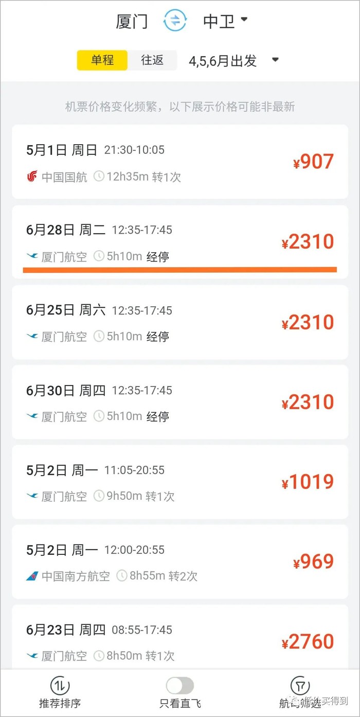 厦门飞中卫,直接购票,单程不转机票价2300元起,厦航全新飞499元,至少便宜1800元。