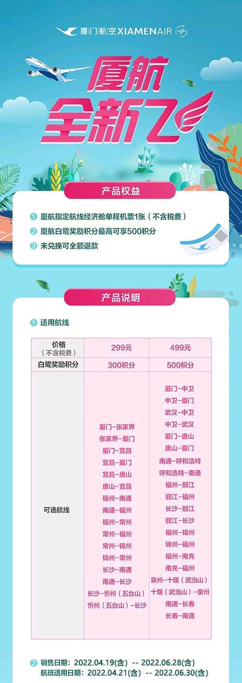 厦门航空全新飞:一款机票兑换次卡,299元或499元每套,每套全新飞由1人使用,可兑换1张单程机票,税费另付。未兑换机票可全额退款。