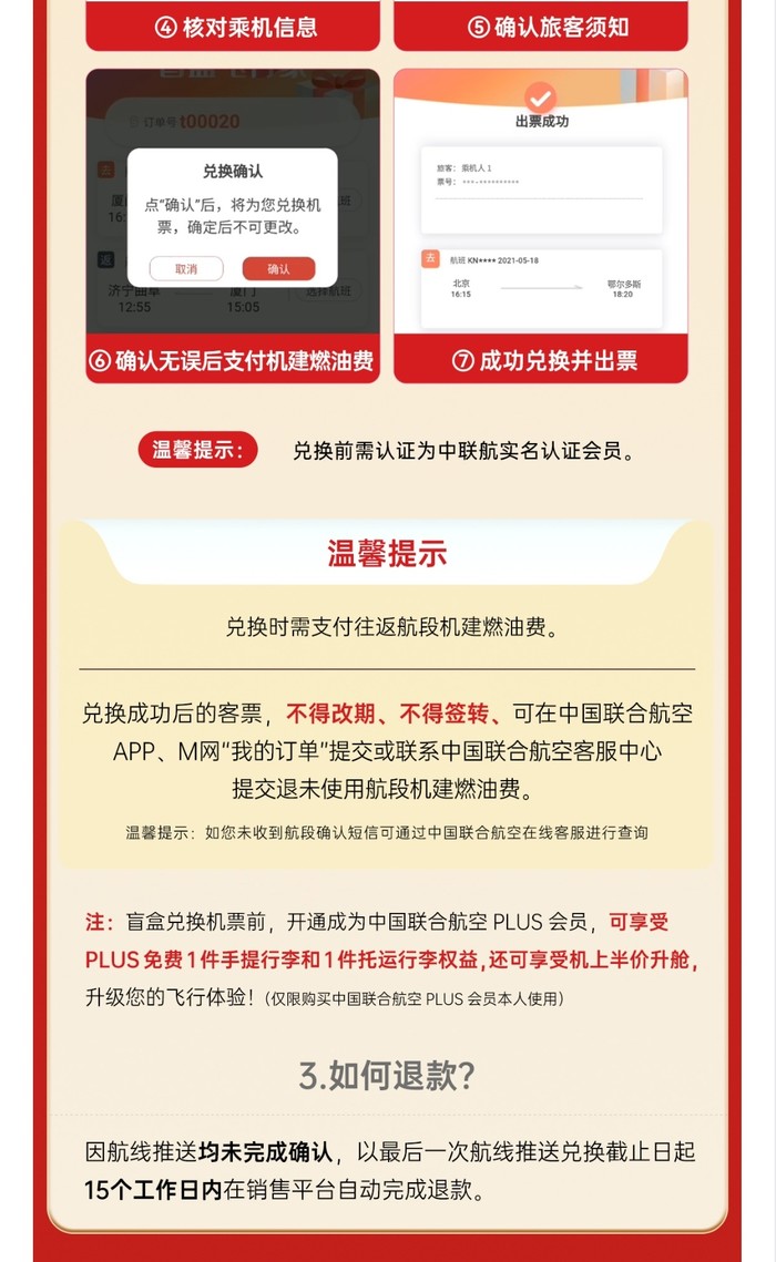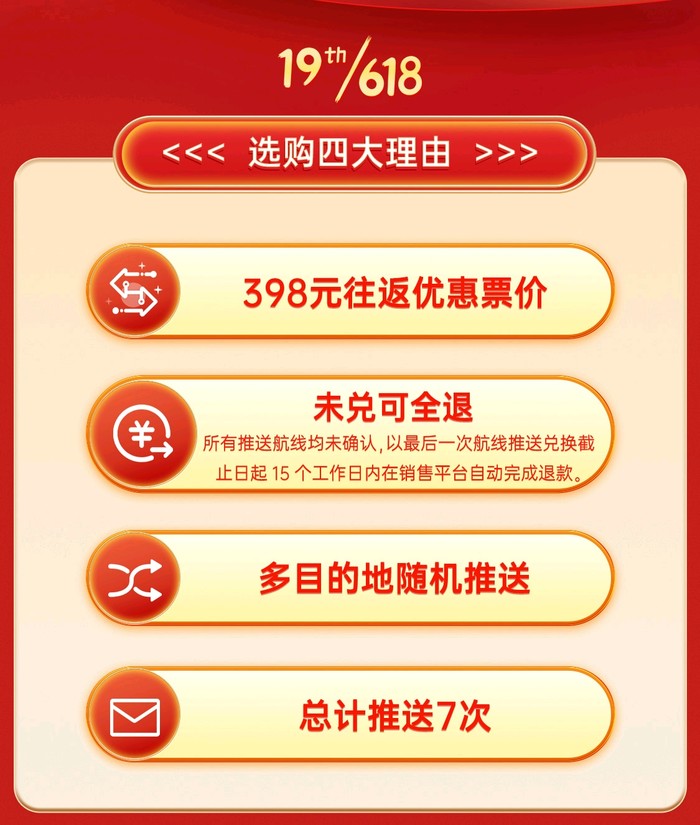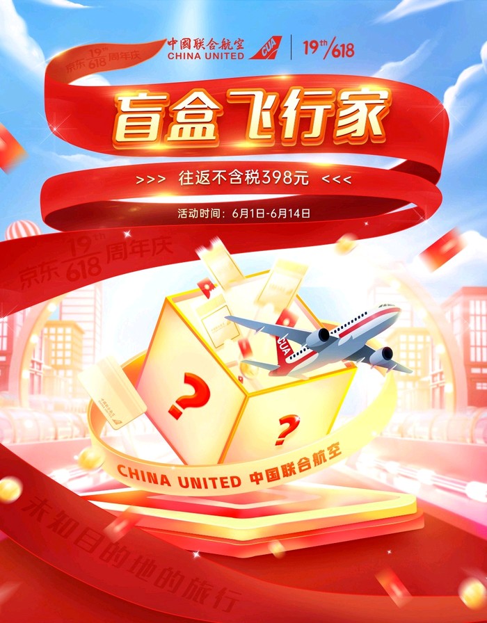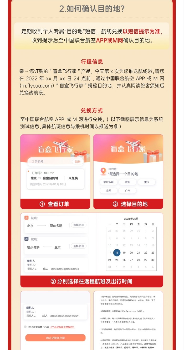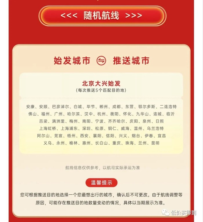 中国联合航空的“盲盒飞行家”产品也再次开卖,只有北京出发,目的地定期随机更新,价格398元/套,可兑换一套往返机票,税费另付,未兑票可全额退款。