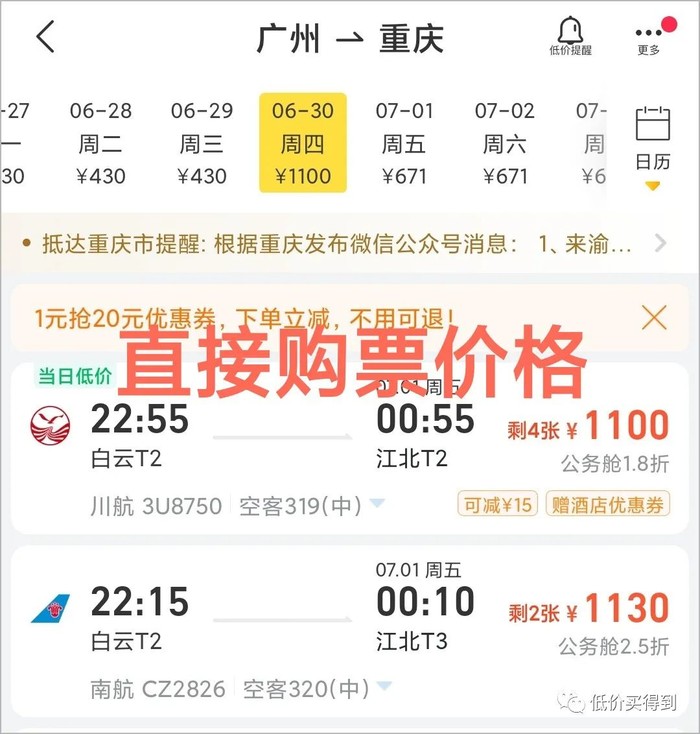 广州飞重庆公务舱,直接购票价格1100元起,海航公务舱次卡便宜460元(1080-635)。