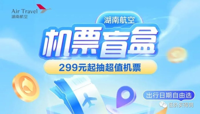 近期,湖南航空推出了一款机票盲盒,299元/套,每套可兑换一张单程机票,税费另付。