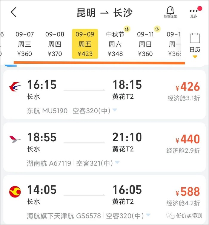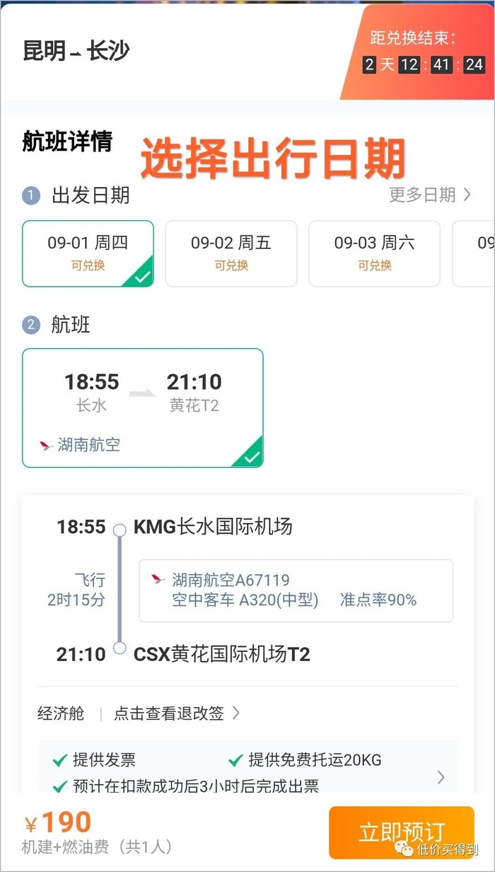 如果想中秋从昆明去长沙玩,选择9月9日 18:55那趟航班(票价440元)兑换就很好,299元用出440元的价值。