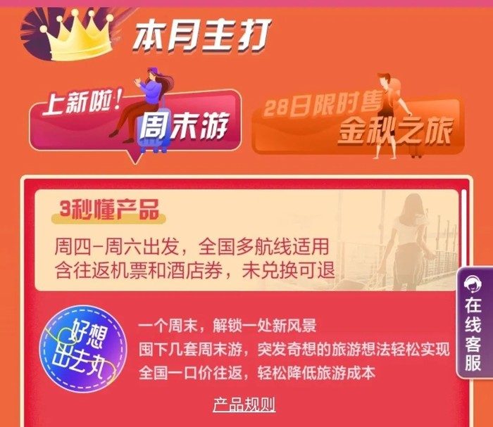 新品周末游,周末出游往返机票盲盒+酒店优惠券。