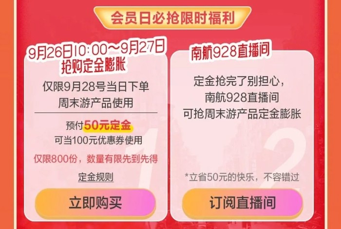 9.26 10点~9.27可以抢定金膨胀,数量有限。相当于花50元买100元优惠券,9.28当天购买周末游产品时可以抵扣。