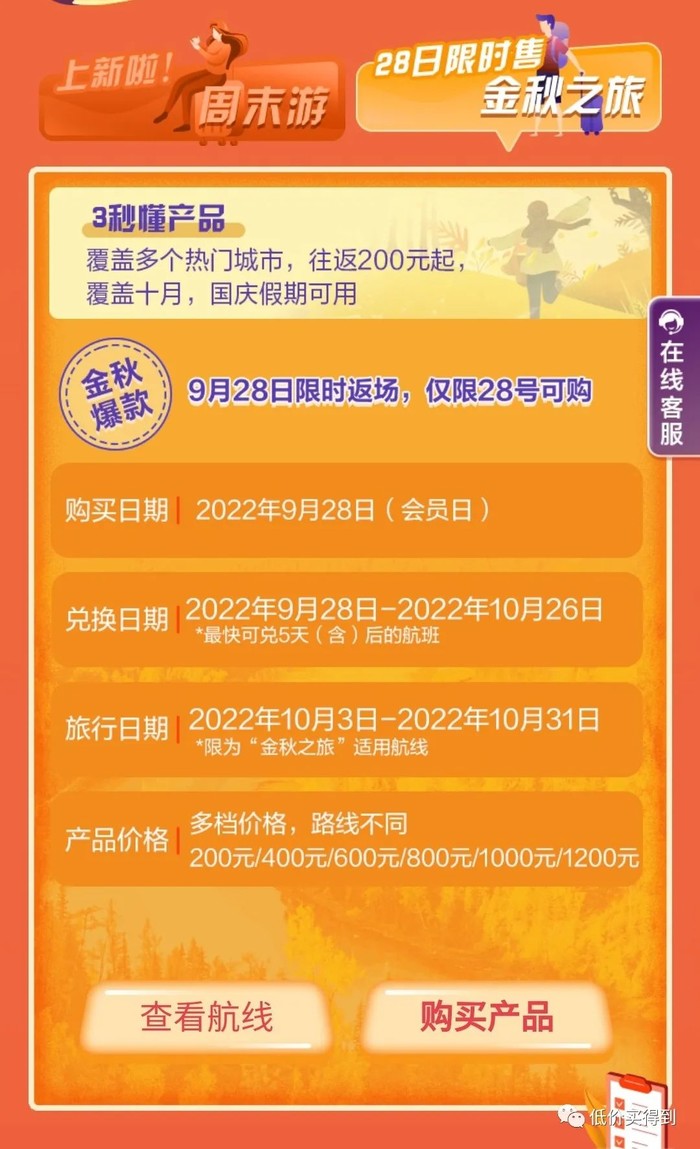 关于金秋之旅的介绍,可以看看“低价买得到”的这篇内容:劲爆!200元任飞2次!