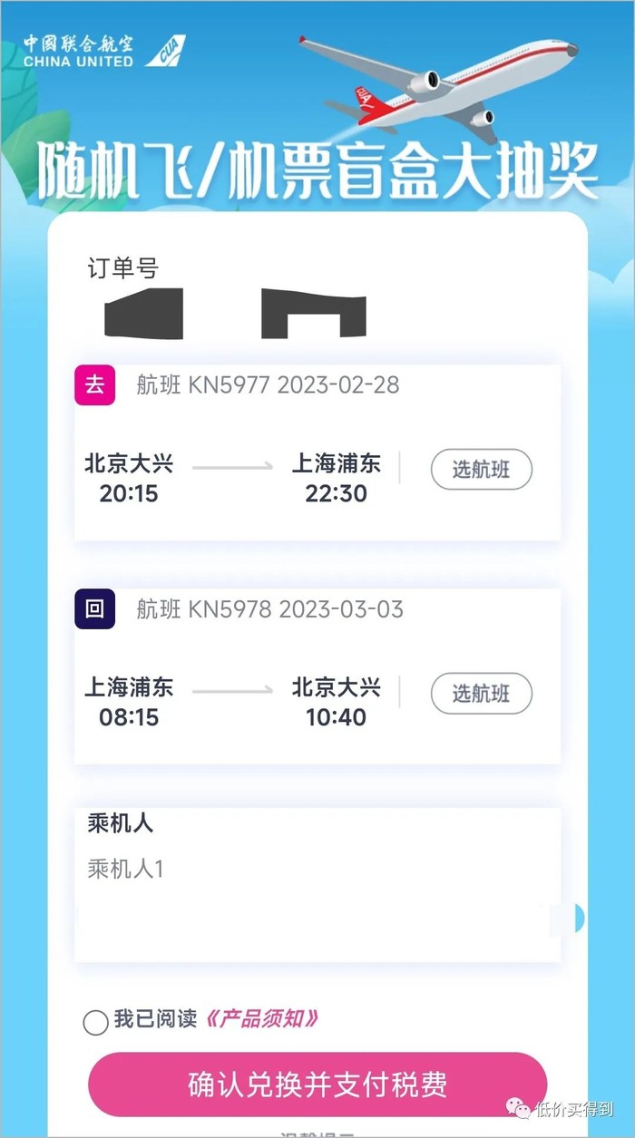 【买了未兑换机票可以退】在中国联合航空APP花 298元购买一套“随机飞”机票盲盒,然后兑换一套往返机票。
