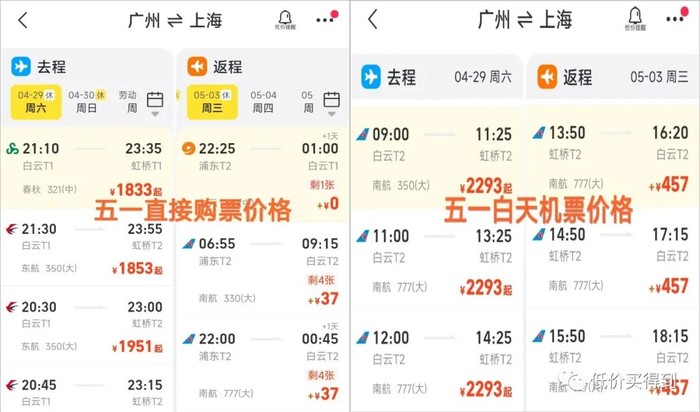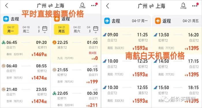 广州往返上海,直接购票,平时票价1460多元起;选白天时间好一点的南航航班,票价2900多元起。