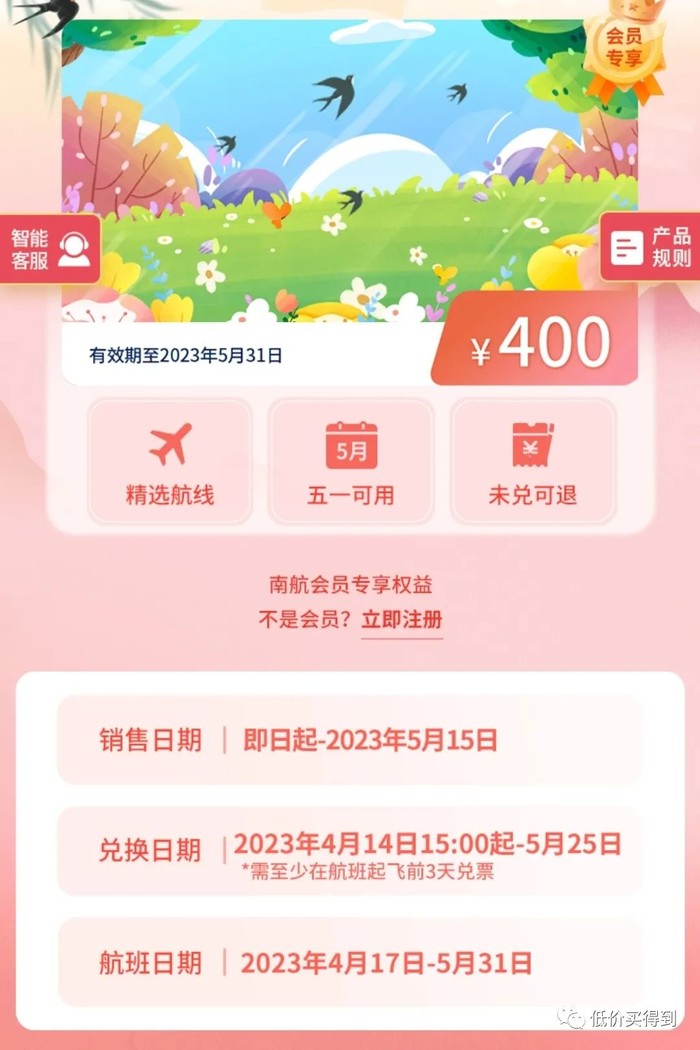 南航踏青之旅,400元/套,购买之后,有2次以优惠价购买机票的名额,税费另付。
