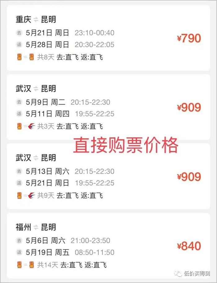 重庆/武汉/福州往返昆明,直接购票790元~900多元,祥鹏次卡便宜200~300多元。