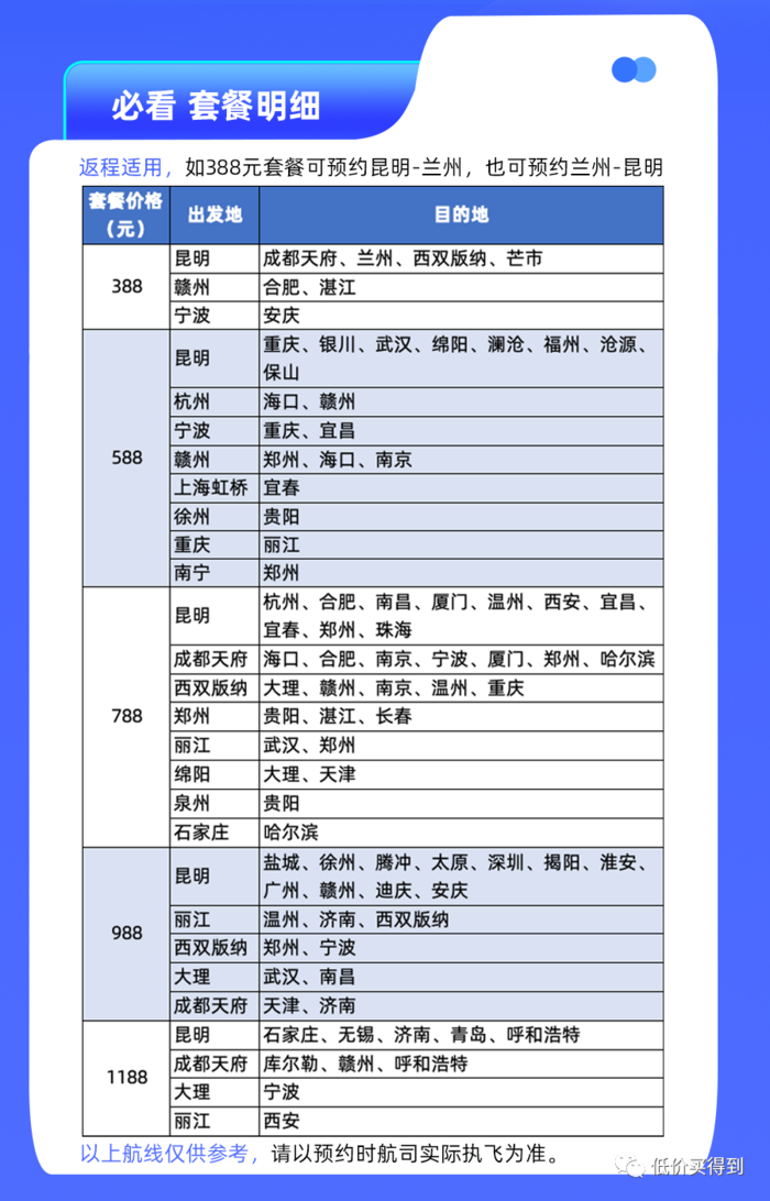 1188元档:成都=库尔勒,宁波=大理,成都/昆明=呼和浩特等。