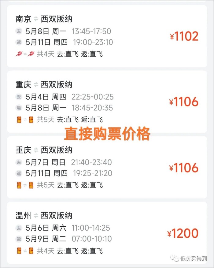 南京/温州/重庆往返西双版纳,直接购票1100~1200元起,祥鹏次卡便宜300元~400元。