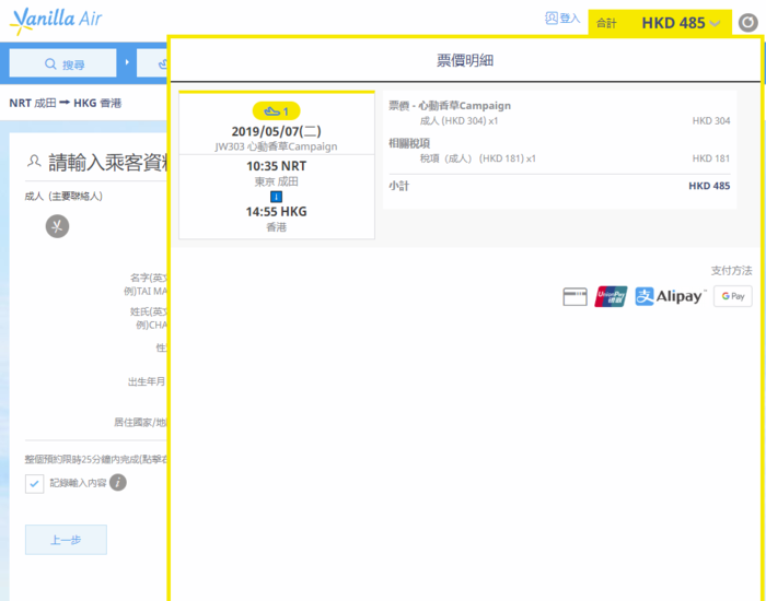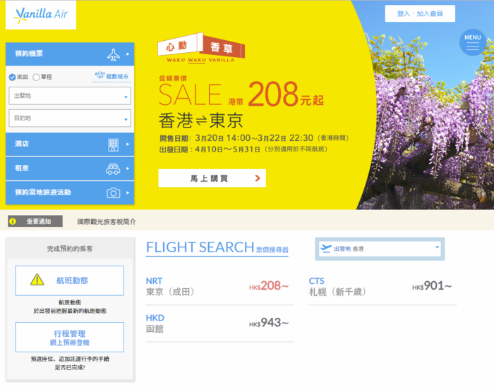 香草航空心动香草优惠,208港币(约合180元人民币)飞东京(不含税)