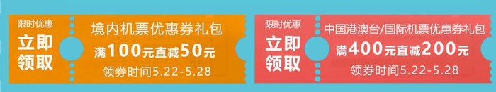 会员日活动界面还有两种优惠券现在已经可以领取了,“国内机票满100减50”以及“国际/港澳台机票满400减200”