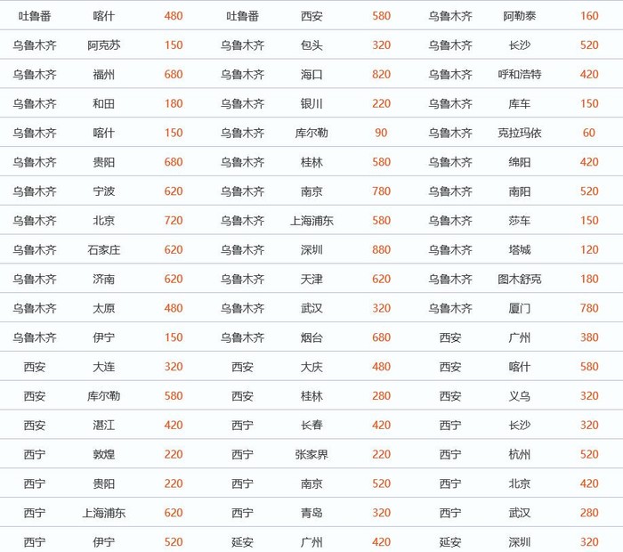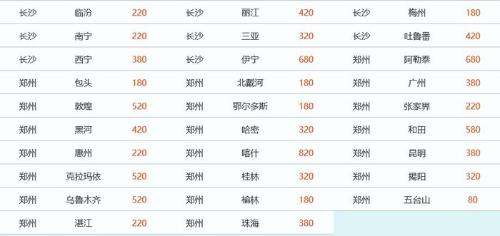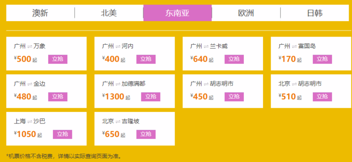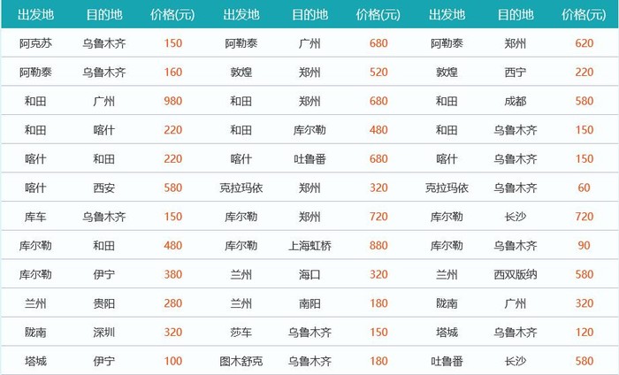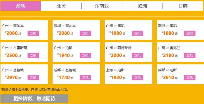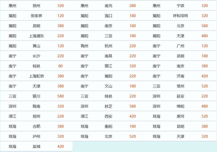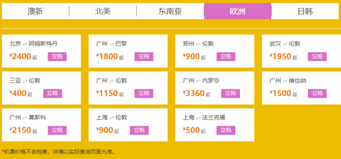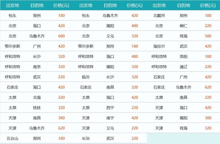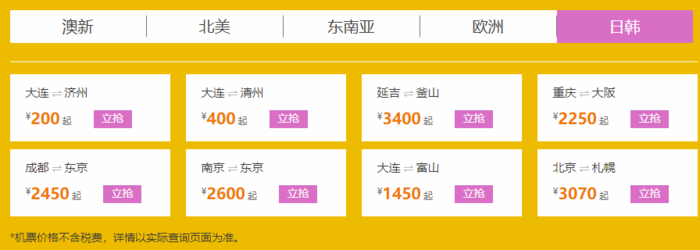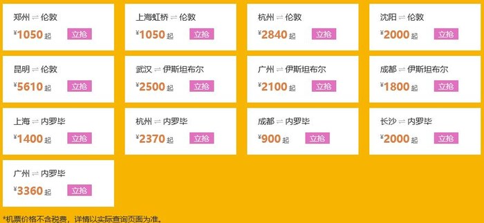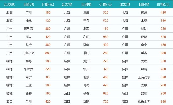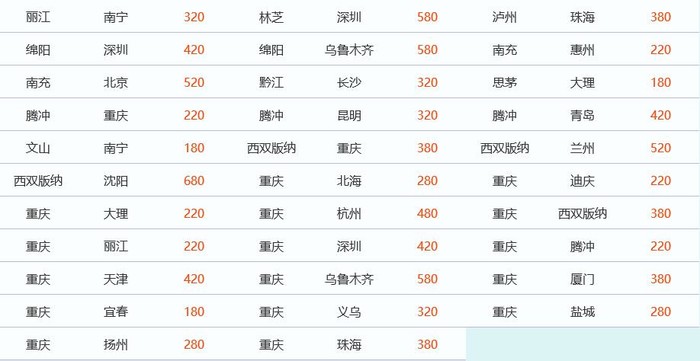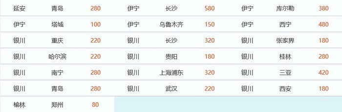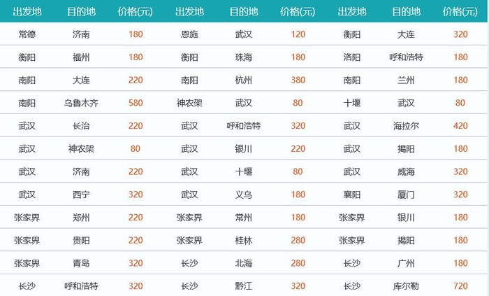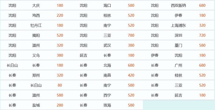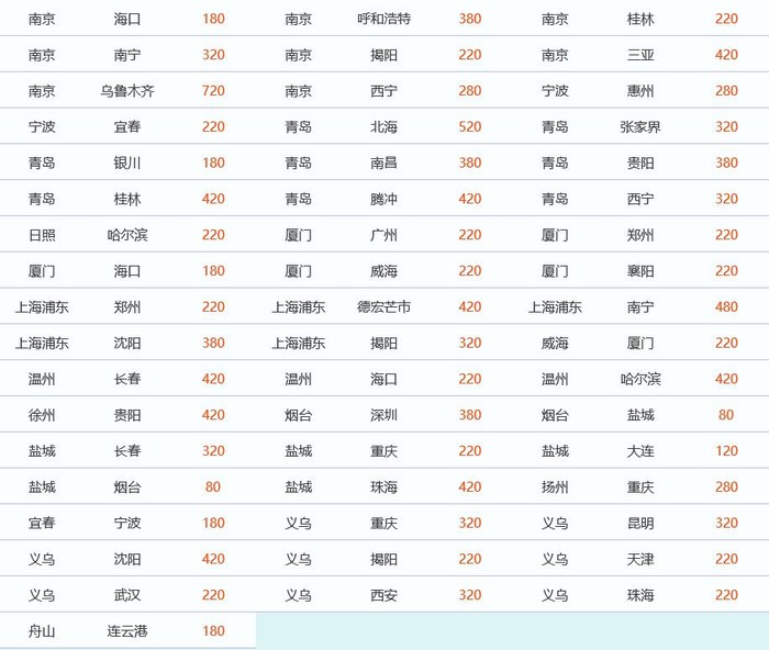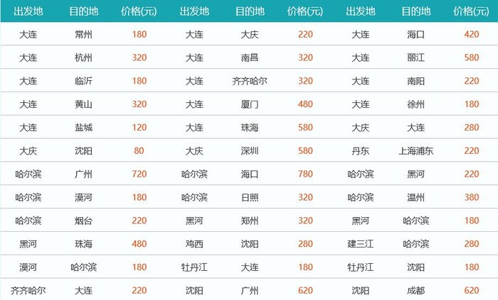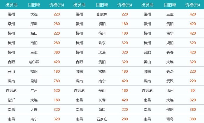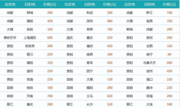 国内航线已全部公布(图上价格加上50元税费,就是总价)