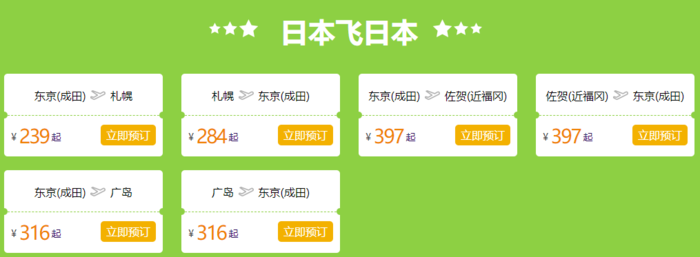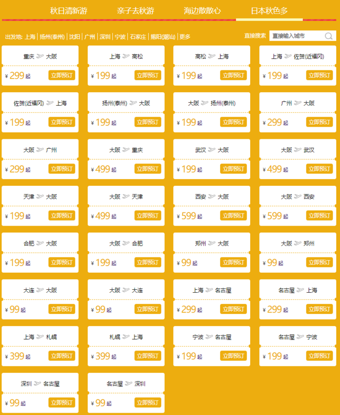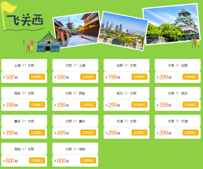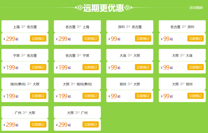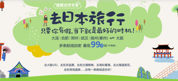 上海、大连、合肥、郑州、武汉、扬州、广州、重庆、天津等地往返日本,税前单程99元起。