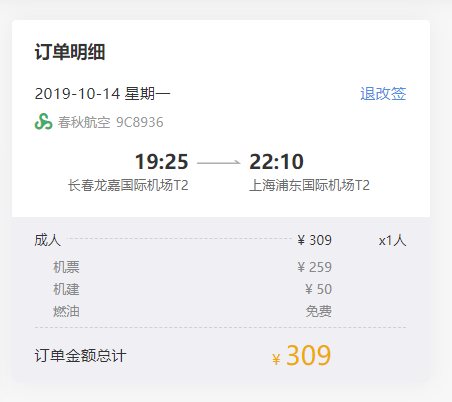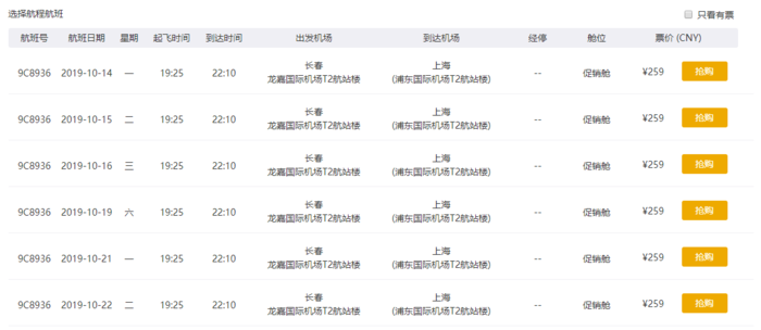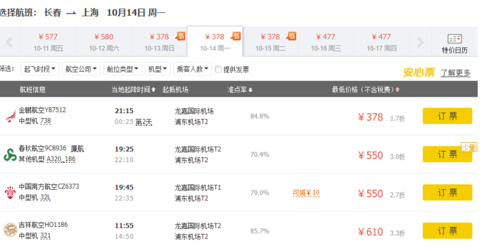 先重点推荐一些国内票,比如长春飞上海,春秋秒杀含税只需309元,同日期在飞猪等OTA平台查询,含税最便宜也要428元,明显春秋的秒杀更划算!