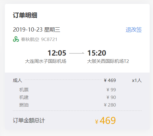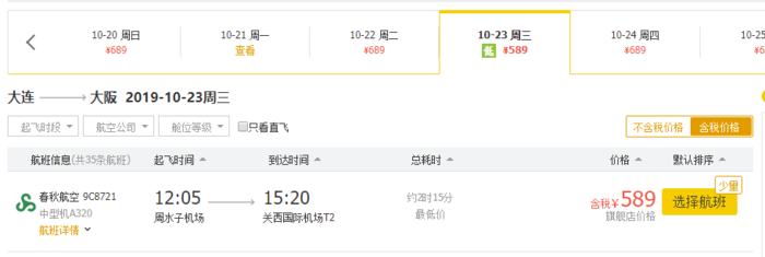 作为对比,在飞猪上搜大连飞大阪,同日期需要589元,春秋官网购买更便宜。