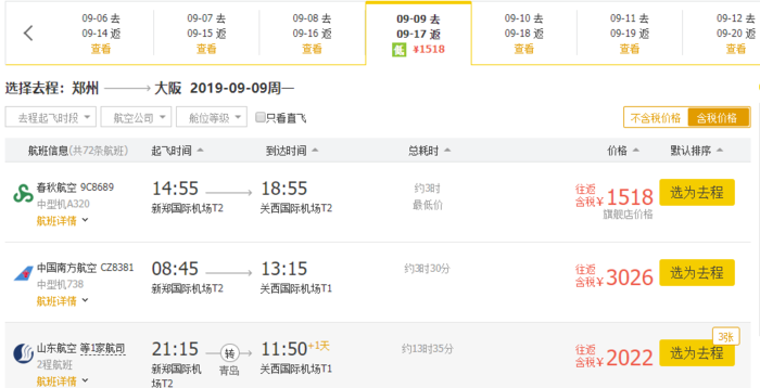 郑州往返大阪,往返约合人民币1017元,含10KG行李托运。