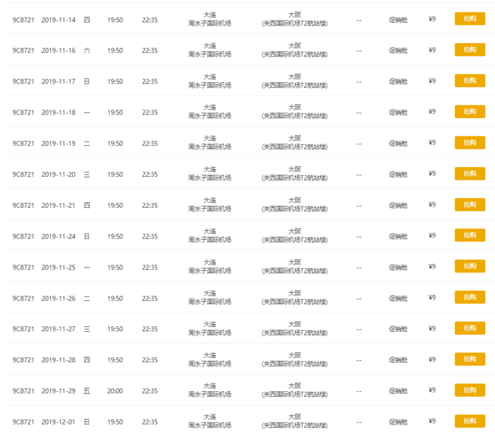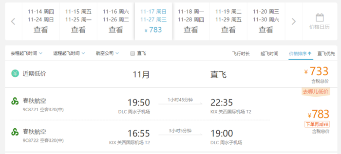 以大连飞大阪为例,出行日期从11月持续到明年3月,包括大热的红叶季,但春节除外。