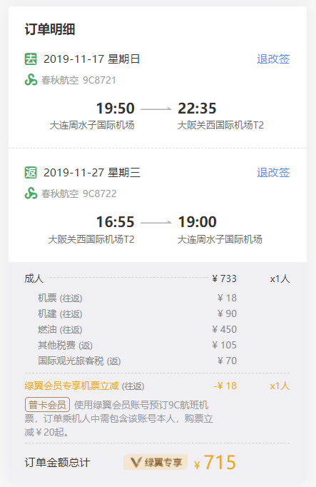 实测:大连往返大阪,春秋官网含税才715元,往返一起下单,会员立减了18元。