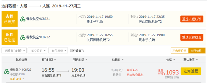 同一航线(大连往返大阪),春秋航空对比其他航司,价格至少便宜一半以上!