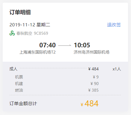 上海飞济州岛,含税484元。