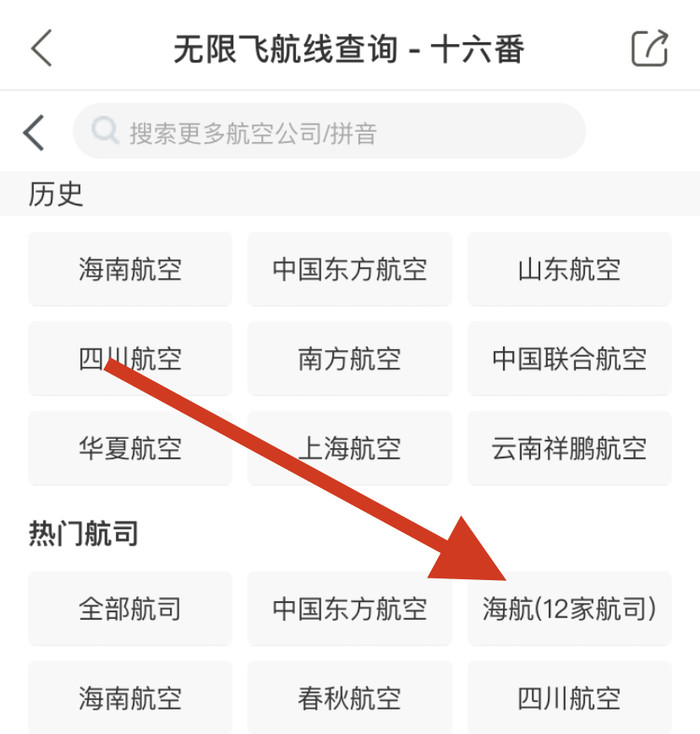 目前十六番的航线查询,已经支持同时查询海航集团航司旗下的航线了(大新华航空除外)