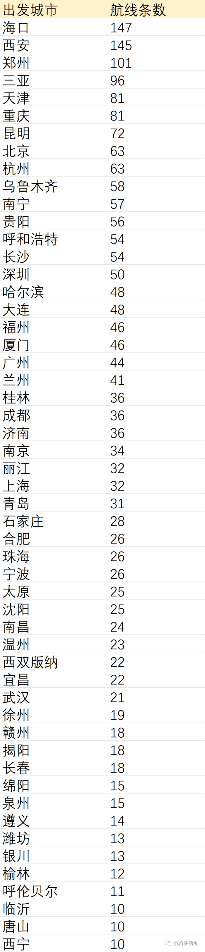 小番通过十六番无限飞查询功能,整理出了海航集团旗下11家航司(大新华航空暂未整理),从全国多地出发的航线条数情况(航线少于10条暂未整理)。