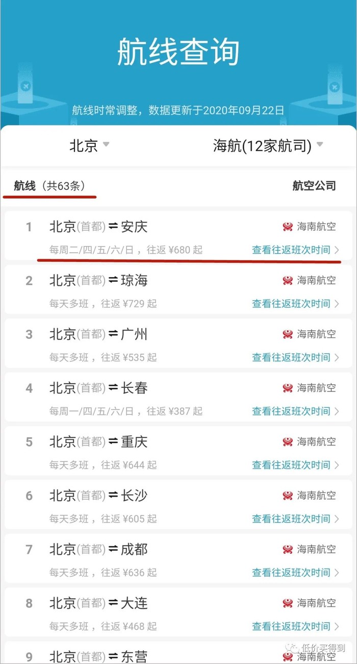 以北京为例,查询后可知,海航集团共63条航线,具体班次和往返时间点击后能看到,图中的价格为该航线近期往返最低价。