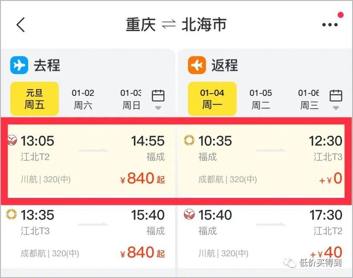 重庆往返北海,元旦出行(1.1出发,1.4返回),直接购票含税940元。