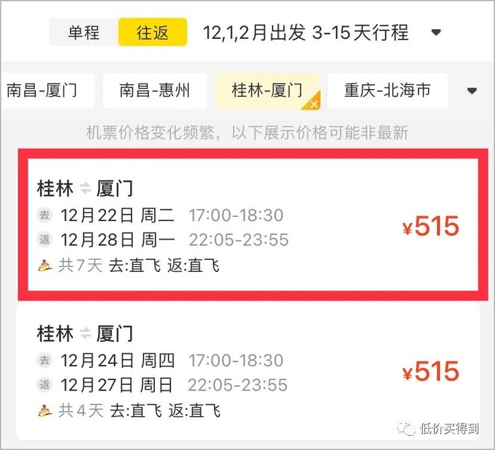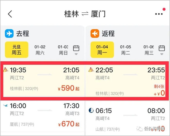 桂林往返厦门,元旦出行(1.1出发,1.4返回),直接购票含税690元。