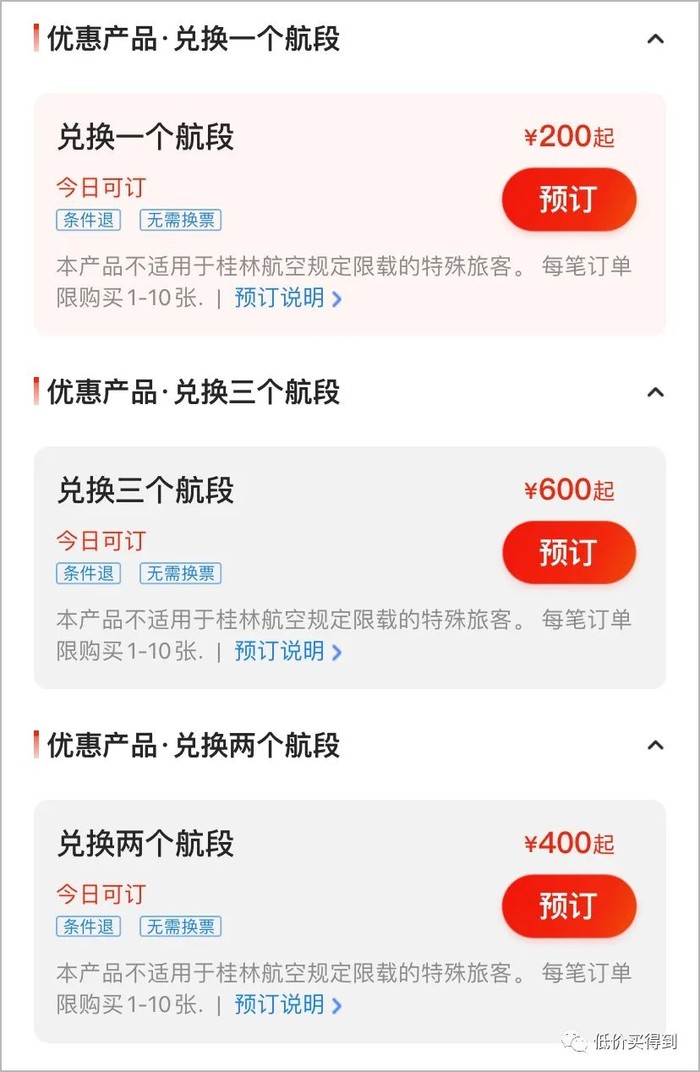600元,可兑换3个航段(3张机票),送3张桂林航空官网30元抵用券。