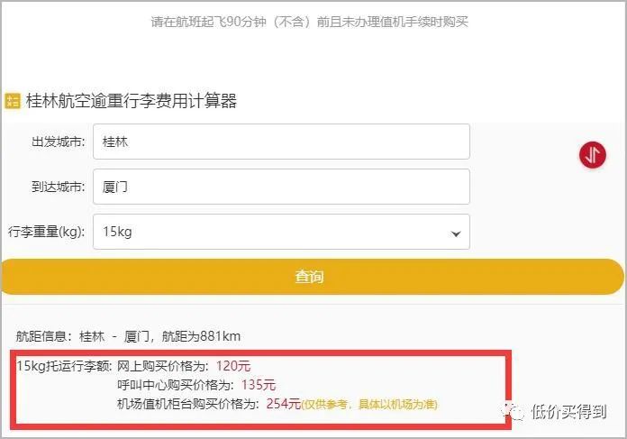 比如桂林飞厦门,购买15kg行李,官网购买120元,柜台购买254元。