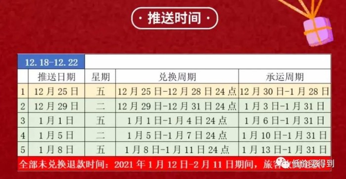 12月25日期,每周二,五推送可选目的地,一共推送5次,具体推送日期、对应的出行时间如下: