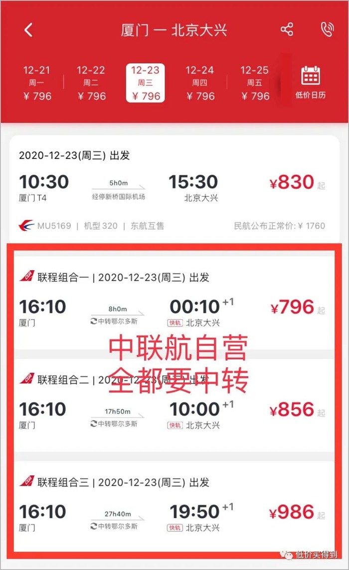 一般来说,盲盒推送的都是航司自营的直飞、或者经停航线,但有群友吐槽,居然给他推送了转机航线……厦门飞北京,中联航自营航线只能转机,耗时8小时到27小时不等……