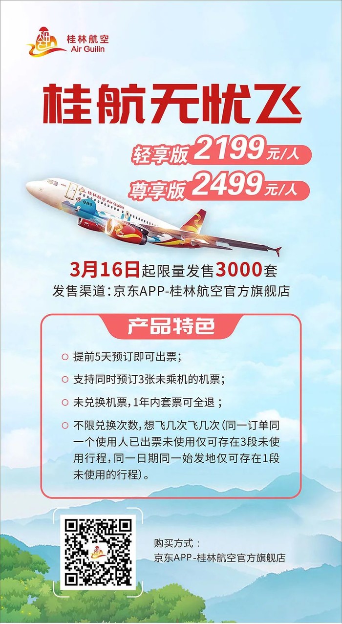 桂林航空将于 3月16日 9:00,在京东APP销售自家的无限飞产品“桂航无忧飞”!销售到4.30截止,或者售完即止。(实测4.1还可以买)