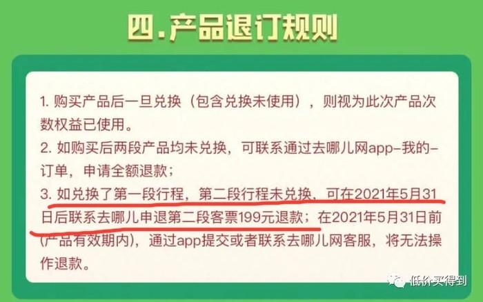 可以部分退款:如果兑换了第一段行程,第二段行程未兑换,可以在5.31后联系去哪儿,申请退未使用行程的199元退款。
