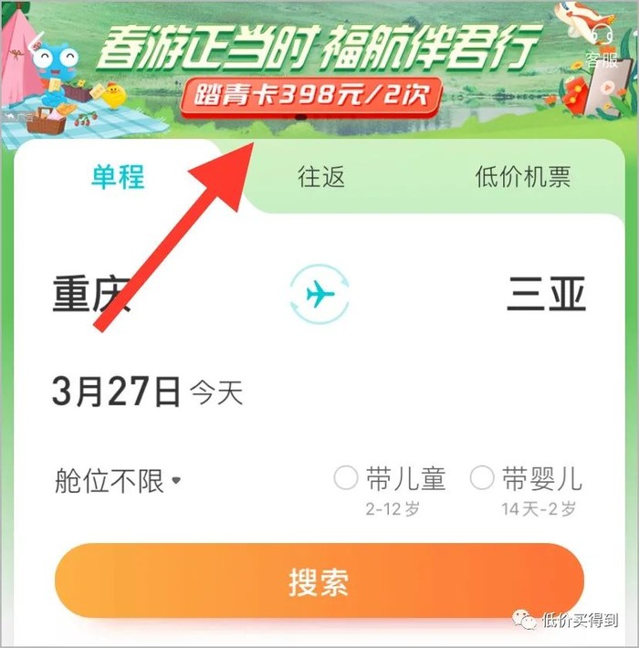 购买“踏青卡”后,在去哪儿机票搜索,找到“踏青卡专享”199元的航线,即可预订。