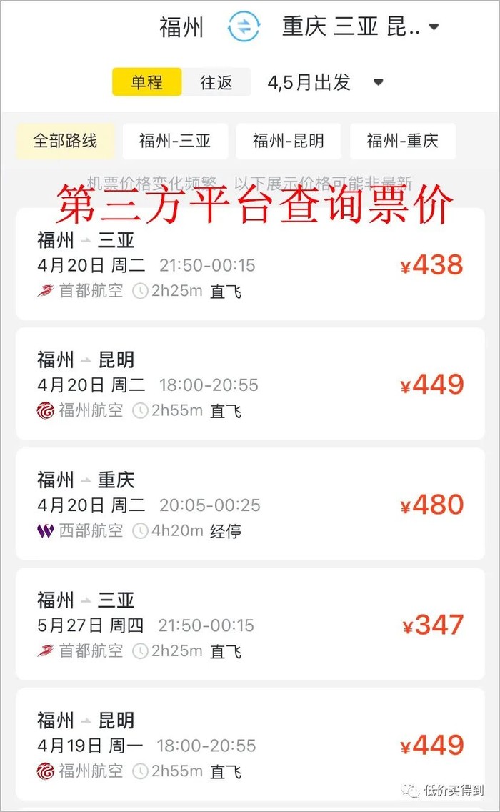 虽然屏蔽了五一,但我看了看,目前在第三方平台搜索,福州飞三亚、昆明、重庆,4、5月单程至少340~450元左右,如果用福州航空踏青卡兑换,单程成本才199元,即使非五一出行,也超划算!春天正好是去这几个城市的好时候。