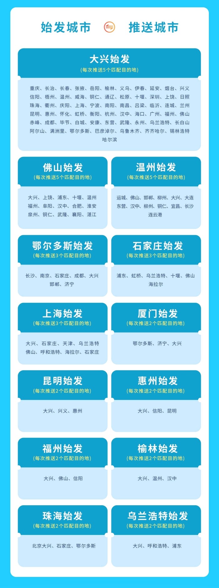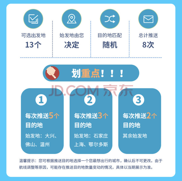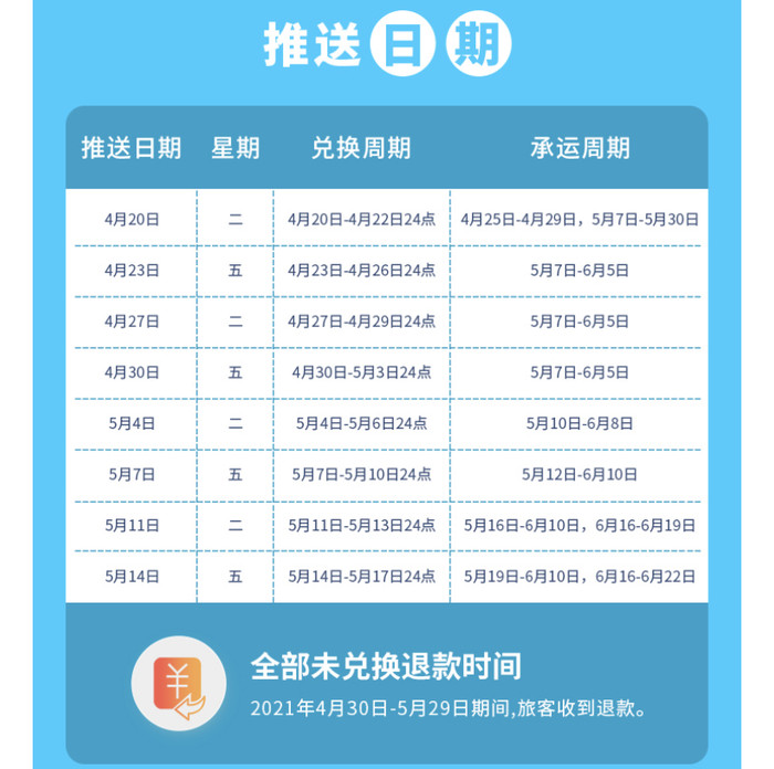每周二,五推送可选目的地,具体推送日期、兑换日期、出行日期如下: